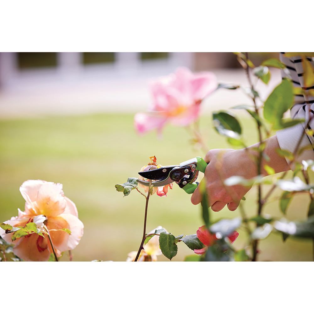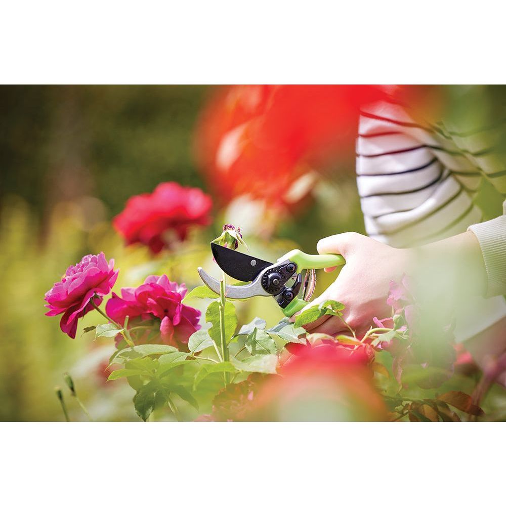 Snoeischaar met aluminium handgrepen. Geharde PTFE-gecoate bladen, veeropening en zachte schuimhandgrepen.