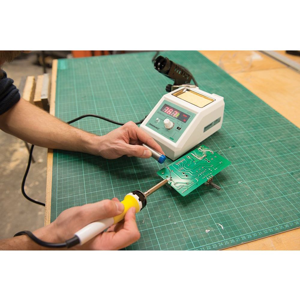Veelzijdige soldeerset, geschikt voor verschillende werkzaamheden. Keramisch element met lange levensduur voor snelle opwarming. Elektronisch instelbare temperatuur met digitale display. 150-480 °C temperatuurbereik. Gemakkelijk, gereedschapsvrij te verwisselen 1,2 mm punt. Ideaal voor delicaat elektronisch werk. Compatibel met soldeerstiften met 5,85 mm binnendiameter en 7,90 mm buitendiameter. Inclusief basis, soldeerbout, kabel, ingebouwde standaard en sponshouder.