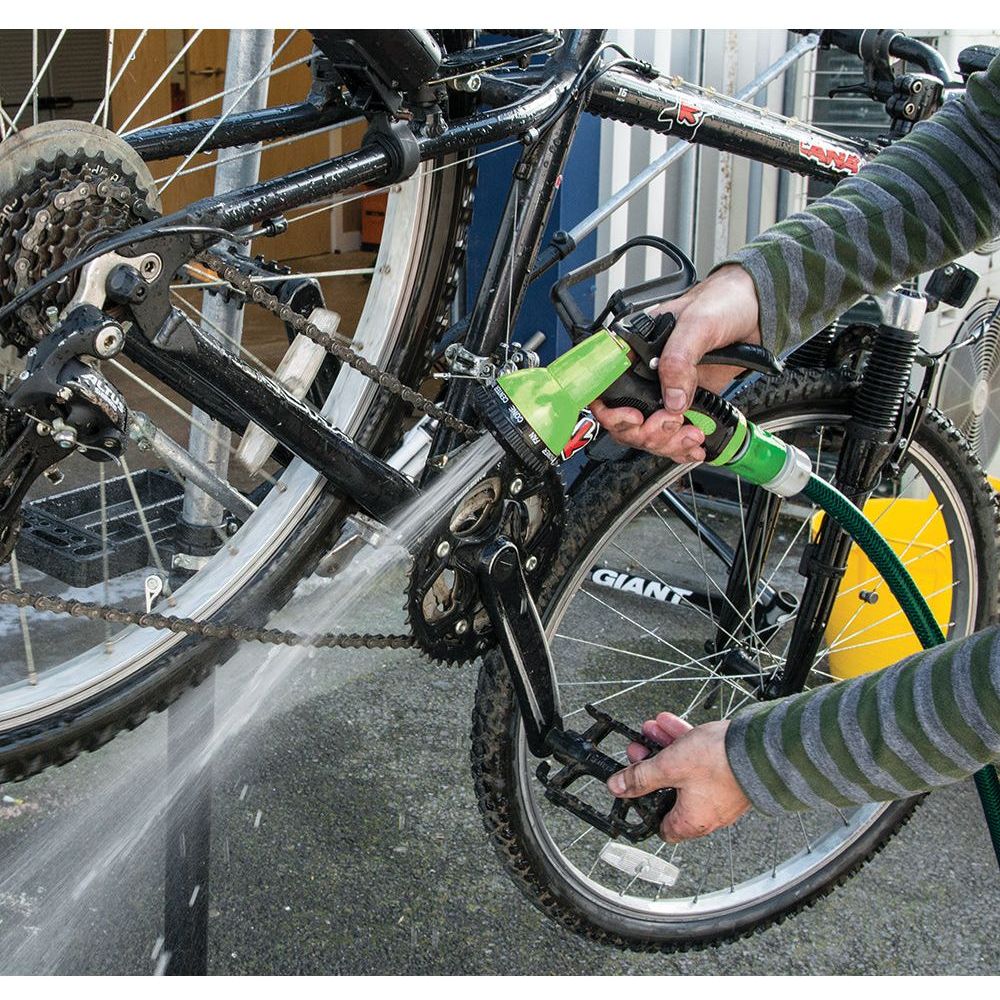Verstelbare kop met 9 spuitpatronen en een rubberen pistool grip. Inclusief 1/2" mannelijke snelkoppeling naar 3/4" BSP.