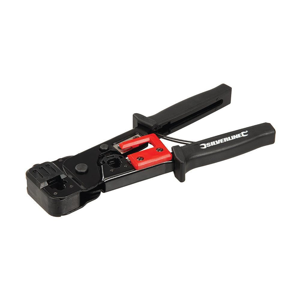 Ontdek de Silverline - Telecomstekker krimptang van 205 mm, een essentiële tool voor zowel de doe-het-zelver als de professionele technicus. Deze hoogwaardige krimptang is vervaardigd uit gehard staal, wat zorgt voor een uitstekende duurzaamheid en slijtvastheid. Of u nu telefonie-installaties of netwerken aanlegd, deze krimptang is uw ideale partner.