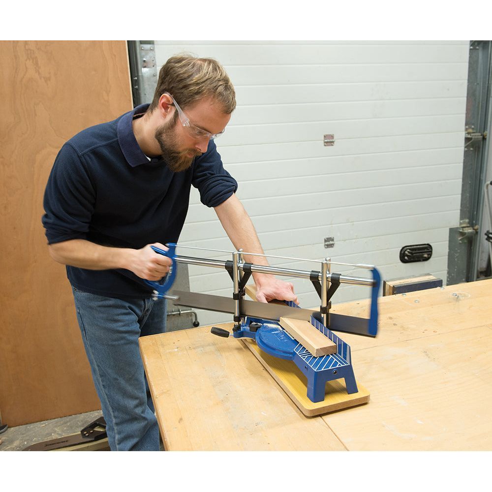 550 mm verstekzaag met 400 mm vaste tafel voorzien van 9 vooraf ingestelde zaaghoeken, klem en verstelbare lengtestop. TUV GS gekeurd. Inclusief zaagblad met geharde tanden.
