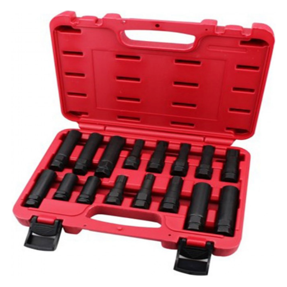 Wielslot verwijder set met 16 verschillende dopsleutels voor de allerlastigste slotbouten voor veel verschillende voertuigen.