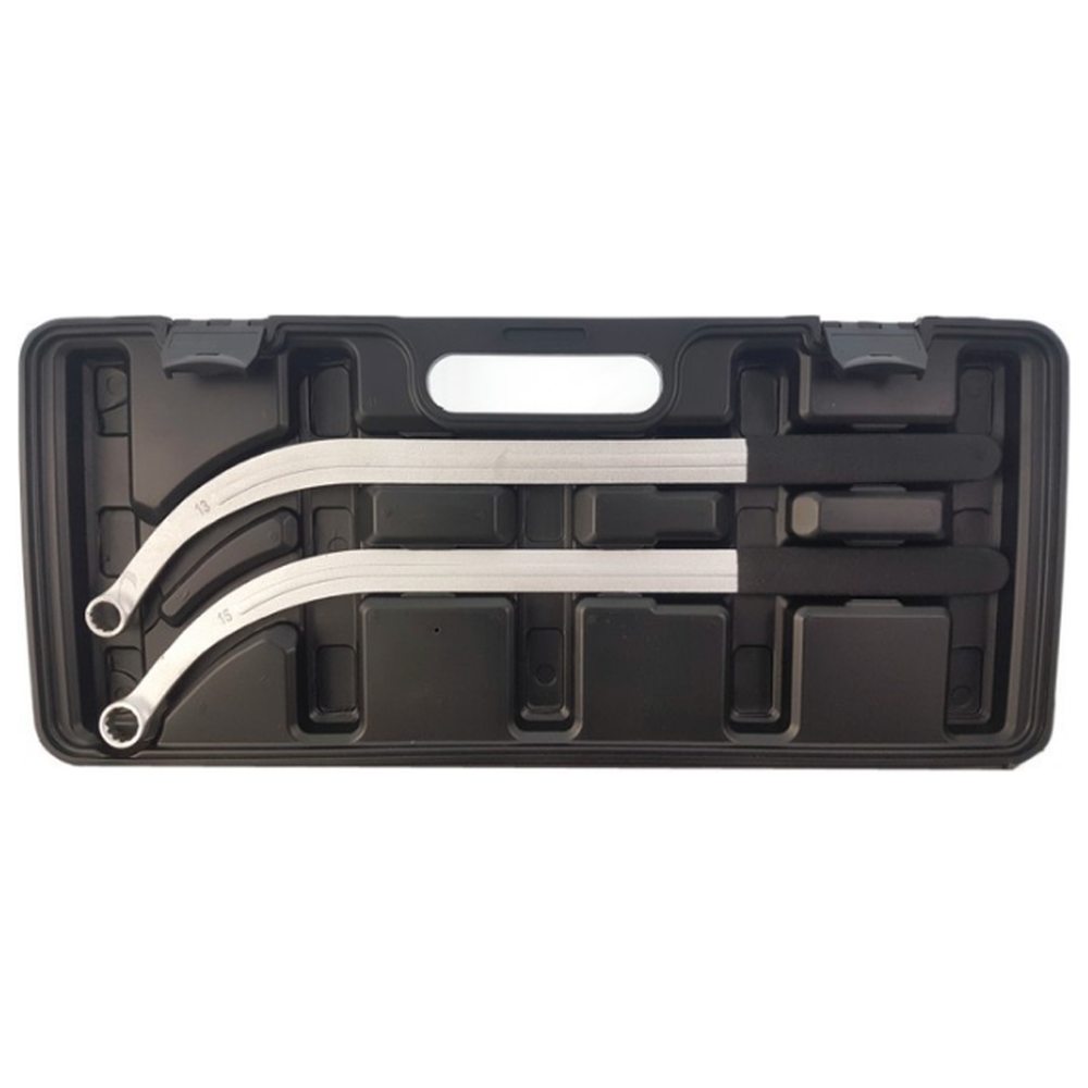 Ontdek de Spanrol Sleutels XXL, de ideale oplossing voor het onderhouden van moeilijk bereikbare tandriemen en v-snaren in uw motorruim. Deze ergonomisch gevormde ringsleutels zijn speciaal ontworpen voor de professional en de amateur monteur die behoefte heeft aan kracht en precisie in krappe ruimtes. Met een indrukwekkende lengte van 460 mm biedt deze extra lange uitvoering een uitzonderlijk bereik, waardoor u zelfs de lastigste moeren en bouten moeiteloos kunt bereiken.