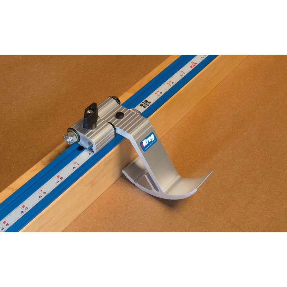 The Swing Stop is designed to work with Kreg Top Trak and Heavy-Duty Trak, so you can build your own fence, install the track, and use the stop. That gives you options and means you can easily use the Production Stop on many types of tools. The stop simply drops into the track from the topside, allowing it to be quickly removed and repositioned.