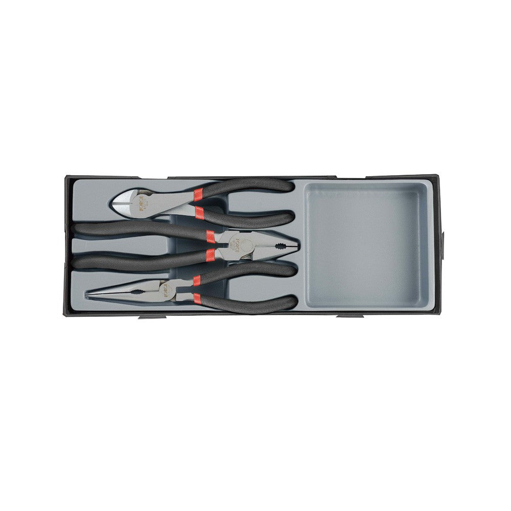 De set bevat drie essentiële tangen die elk hun eigen unieke functies hebben: de zijkniptang van 175 mm (artikel 612175) is perfect voor het knippen van draden en andere materialen met precisie, terwijl de combinatietang van 200 mm (artikel 611215) veelzijdig inzetbaar is voor zowel knip- als verbindingswerkzaamheden. Tot slot is de lange bektang van 200 mm (artikel 610200) ideaal voor het vasthouden en buigen van materialen op moeilijk bereikbare plaatsen.