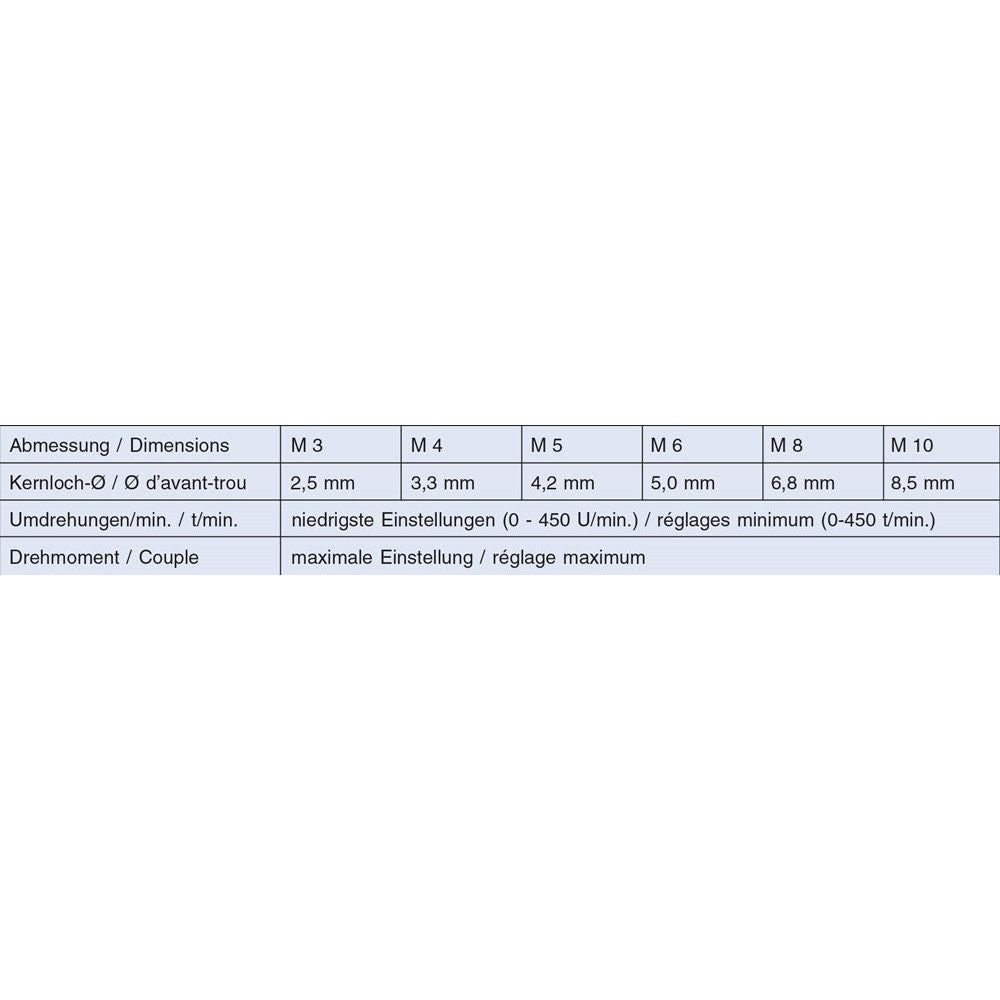 En rechtsdraaiende accu-schoef-boormachines en handboormachines. Ze zijn ook geschikt om met de hand te tappen of met een stationaire boormachine. De accu-machine moet minimaal een vermogen van 7,5 Volt hebben. Let erop dat de as van het gereedschap en de as van het gat in elkaars verlengde liggen en gebruik een geschikte snij-olie..