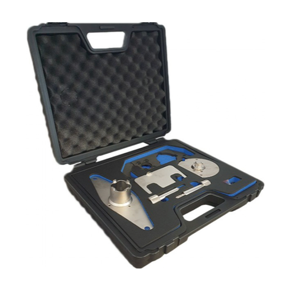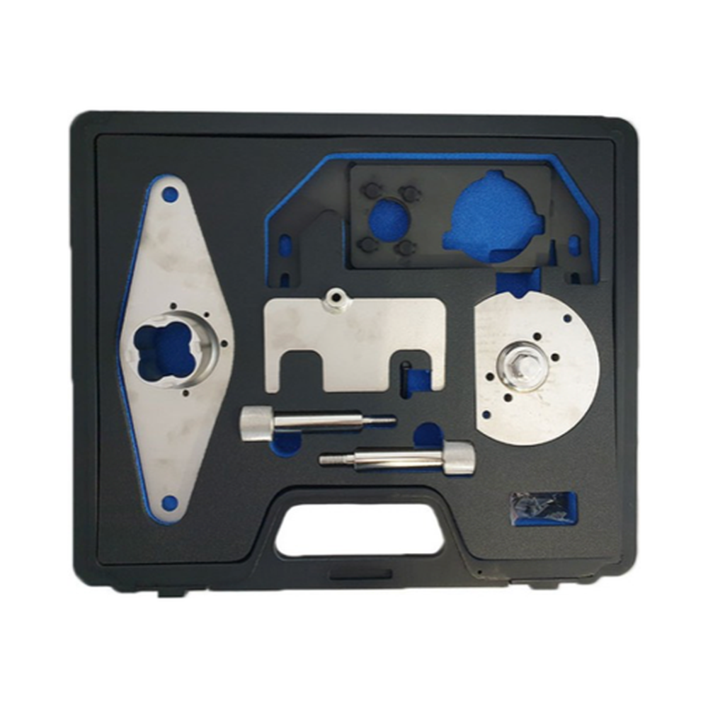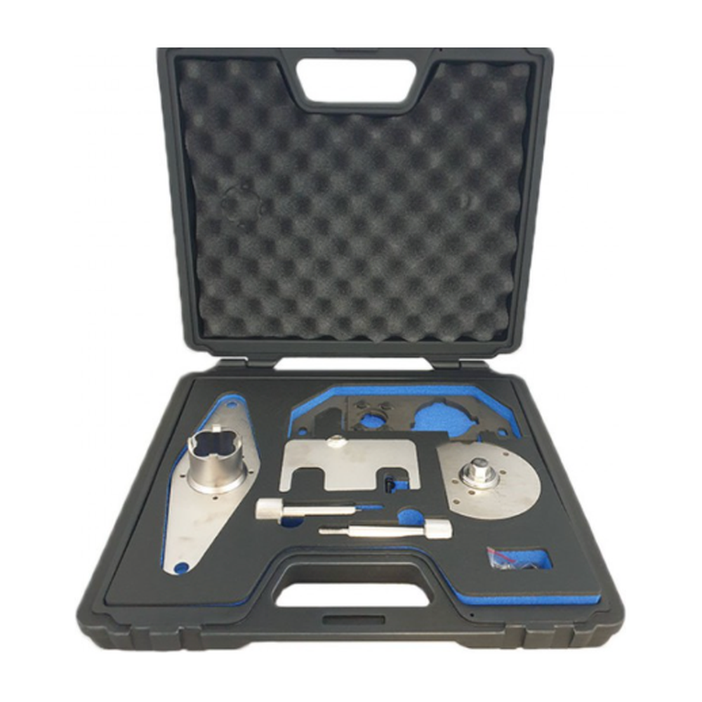 De set bevat ook essentieel gereedschap om de installatie zo eenvoudig mogelijk te maken. Dit omvat onder andere het OEM geboorde blokkeergereedschap 303-1625 voor de nokkenas, het 303-1627 gereedschap voor de dieselinjectiepomp, het 303-1630 blokkeergereedschap voor de krukaspoelie, en het 303-1631 afstelgereedschap voor de nokkenas. Met deze gereedschappen bent u in staat om de timing set nauwkeurig te installeren, wat essentieel is voor een goede motorwerking.