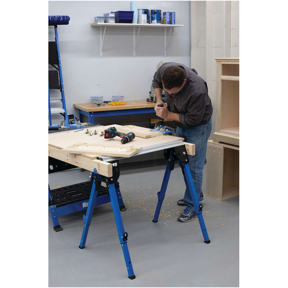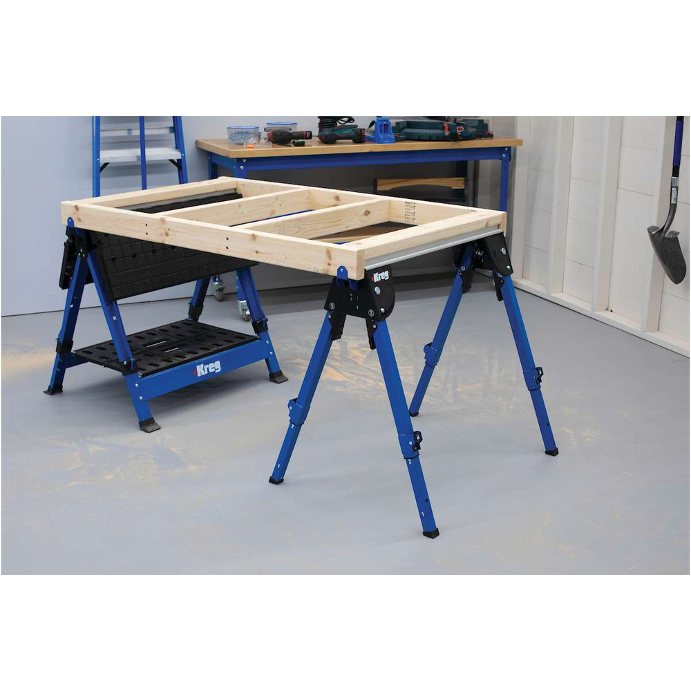 - Adjustable Height 6.63" (168mm) *Ground-level use with legs folded; 24.65" (626mm); 31.65" (804mm) †Matches the height of the Kreg Mobile Project Center; 32.65"(829mm); 33.65" (855mm);34.65" (880mm); 35.65" (906mm)